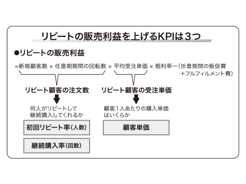特に、リピート顧客の販売利益を算出するのは少し複雑な計算式になるので挫折しがちですが、LTV算出の計算式からリピートの販売利益を大きくするために重要な項目が分かります(別掲参照)。