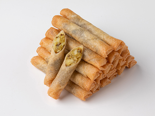 「ある時、当社社員5人で肉の卸先のお客さまのところに食事に行ったところ、からしれんこんをアレンジした料理が出てきました。私はただおいしいと思っただけでしたが、一緒にいた統括部長が『他にもアレンジできるのでは!』と考え、『からしれんこん棒』開発のきっかけになりました。からしれんこんの味はしっかりと残し、誰でも食べられるくらいの辛さに控え、食べやすいスティック状の揚げ春巻きにしました」