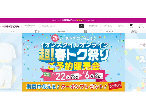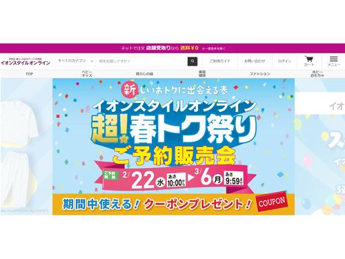 急成長している「イオンスタイルオンライン」は、ファッション(アパレル)・ベビーキッズ用品・ホビー・暮らしの品・インテリア・家電・コスメ化粧品を扱うネットショップ。商品配達以外にイオンの店頭で受け取れるサービスも行っている。