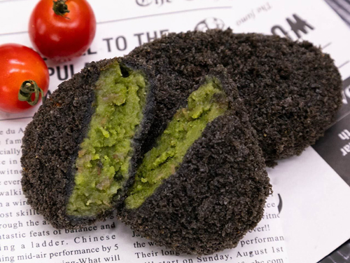 「商店街がある一条通を、付喪神(つくもがみ)と呼ばれる古道具の妖怪たちが行進したという伝説に基づき、妖怪ストリートとして町おこしをしています。妖怪コロッケ3種は、黒い衣に竹炭を使っており、見た目の強烈さと食べた時のギャップがいいという声が多いです。テレビや雑誌で紹介されたことがきっかけで、人気商品になりました」
