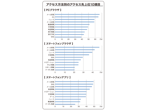スマートフォンブラウザで利用されている上位3項目は「メール受信」(47・2%)、「メール送信」(42・2%)、「ニュース」(39・6%)。