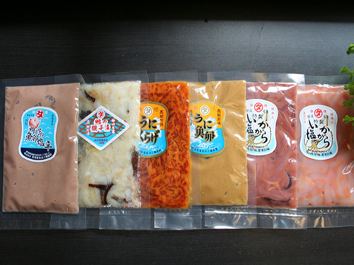 「鯛の子印 魚卵塩辛」をはじめ珍味6品を楽しめる「お試しセット」は、ネット限定商品。まず食べてもらうために商品化した。