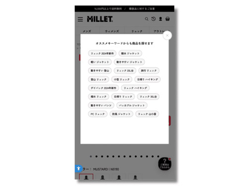 登山ブランドを展開するミレー・マウンテン・グループ・ジャパンはこのほど、ECサイト「ミレー 公式オンラインストア」に転換率(CVR)向上のための施策を実施した。AIを用いて生成した商品特徴軸のハッシュタグで商品を探しやすくする機能の提供を開始した。商品一覧ページやポップアップに顧客の関心のあるキーワードや商品を表示し、CVR向上を図っている。