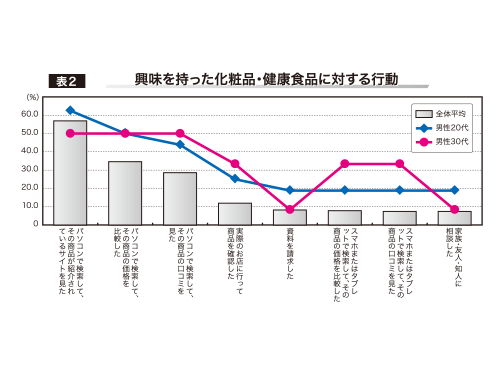 調査は15年12月にGMOリサーチが運営するアンケートサイト「infoQ by GMO」の調査パネルを用いて、楽天リサーチが調査実施機関として行い、600件のサンプルを回収した。このうち化粧品、健康食品に興味があると回答した20~60代の男女269人のデータをまとめた。