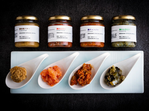 「鯛チャンジャ」「鯛めんたい」「鯛のお茶漬け」「鯛味噌バター」の4種類があり、おつまみやアレンジ料理などさまざまな形で食べられるのも人気の秘密だ。