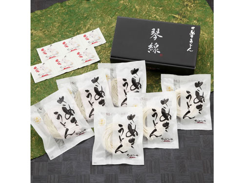 こんぴらやの看板商品は、こだわりの詰まった讃岐うどん。贈答用の最高級麺「琴線」から、自宅用のお手頃商品まで、さまざまなタイプを取りそろえている。
