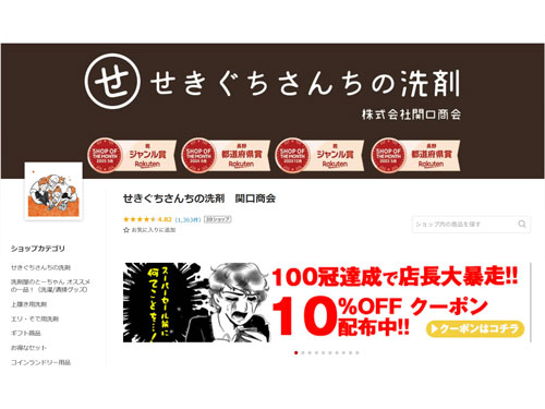 福祉施設や病院、コインランドリー向けなどクリーニングの開業支援からコンサルティングまで行い、17年よりEC事業をスタート。「楽天市場」をメインにオリジナル洗剤ブランド「せきぐちさんちの洗剤」を販売しています。