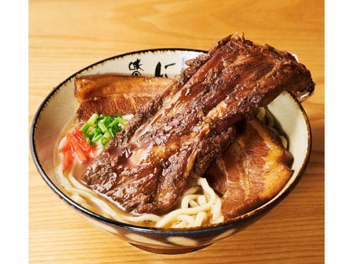 トロトロの三枚肉と「どデカソーキ」が乗った「にしんすにそば」はインパクト十分。一つ一つの工程にこだわった独自の味が人気の秘密だ。
