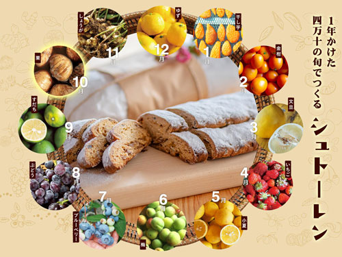 まずこのサイトの最たる特徴は、素材への徹底したこだわりです。四万十の地で収穫される季節の果物・野菜を、ドライフルーツではなく、生のフレッシュな状態から月毎に仕込み、1年を通じて12種類の素材を集めて熟成させ、それをシュトーレンという形で焼き上げています。