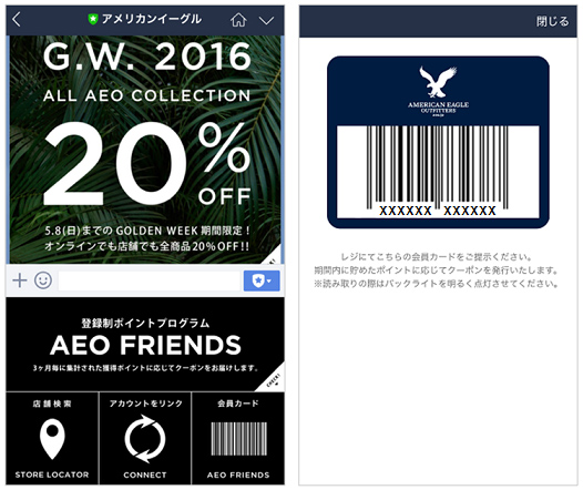 - 【EC向けサービス事例】第88回<LINEビジネスコネクト> 導入サイト「アメリカンイーグル アウトフィッターズ」/LINE活用した会員向け新サービス('16/05/20)