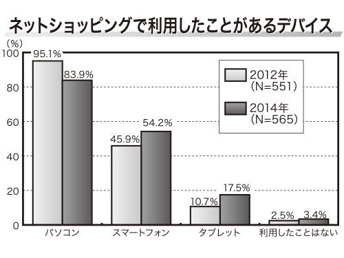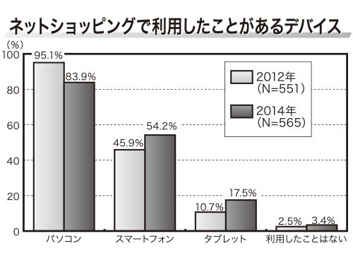 「ネットショッピングに利用したことのあるデバイス」を尋ねる質問には、PCと回答した人が83・9%いた。スマホが54・2%、タブレットが17・5%と続いた。「利用したことがない」と回答した人は全体の3・4%だった。