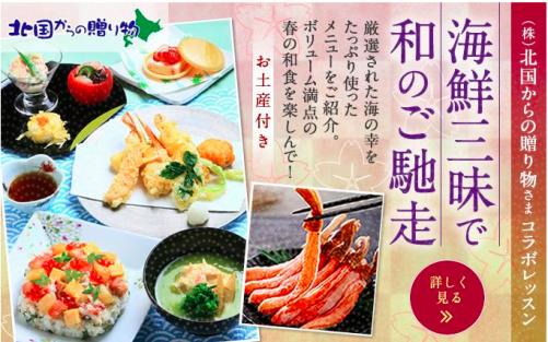 コラボレッスンのテーマは「海鮮三昧で和のご馳走」。当社が取り扱うカニ、ホタテ、イクラ、タマネギドレッシングなどを提供し、料理教室に通う受講生に北海道のグルメ料理を作ってもらった。