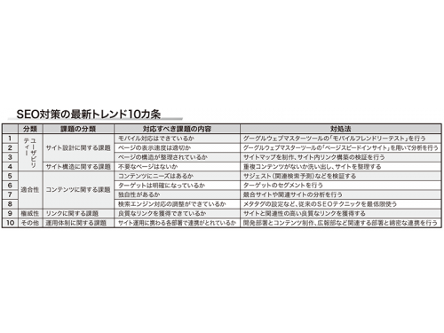 サイトの価値向上を支援するクロスフィニティ(本社東京都、加藤毅之社長、(電)03―5745―3838)によると、15年の国内SEO市場の推定市場規模は、前年比10.9%増の395億4000万円だったという。同社では「グーグルが、スマートフォン(スマホ)向け検索アルゴリズムの導入を開始したことがきっかけとなり、SEOのニーズが高まった」(広報)と分析している。そんな中、事業者はどんなSEO対策をとるべきか。SEOに詳しい有識者への取材をもとに、SEO対策の最新トレンド10カ条を作成した(=表参照)。