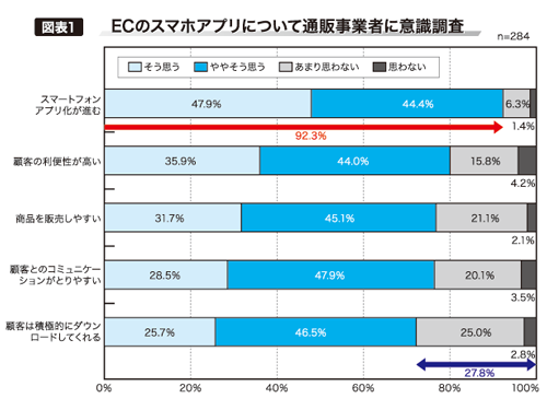 通販システム構築のエルテックス(本社神奈川県、森久尚社長、(電)045―332―6655)は8月、通販事業者を対象とした、スマートフォン(スマホ)アプリに関する意識調査を実施した。「ECのアプリ化が進む」と回答した人は92.3%にのぼったが、顧客が積極的にダウンロードしてくれるとは思わないと回答した人も27.8%いた(図表1)。