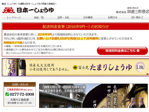 しょうゆの製造・販売をしている岡直三郎商店(本社東京都、岡賢治社長)は自社製造のしょうゆを販売するECサイト「日本一しょうゆ」=写真=を運営している。今年でECサイト開設12年になるが、ECサイトの売り上げはここ数年右肩上がりが続いている。ECサイトと自社のしょうゆ蔵を連動させることによって生まれた「しょうゆ蔵見学」や「樽のオーナー制度」といった企画が、好調の要因になっているという。