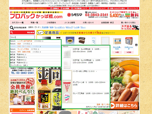 食品用の包装資材などを販売するECサイト「プロパックかっぱ橋.com」を運営するシモジマ(本社東京都、下島和光社長)は今年10月、ECサイトの離脱率を改善させるため、システム開発のアピリッツ(本社東京都、和田順児社長、(電)03―6690―9870)が提供するサイト内検索システム「AdvantageSearch(アドバンテージサーチ)」を導入した。シモジマは、これまで約15%に上っていたサイト内検索後の離脱率を、7%程度まで引き下げたい考えだ。