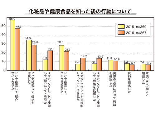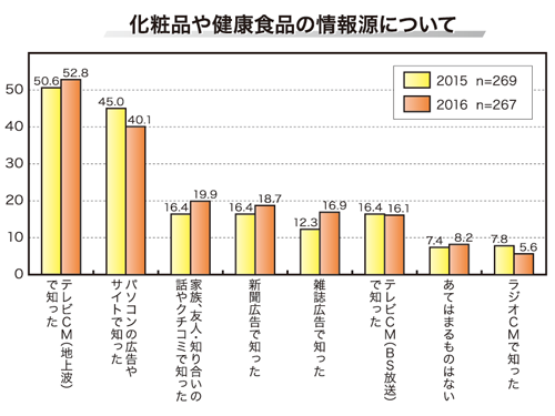 「化粧品、サプリメントなどの健康食品に興味がある」と回答した人に情報源について質問したところ、昨年同様に「テレビ」がトップで2・2%増加した。15年調査に比べ、新聞広告や雑誌広告など「紙メディア」も増加している。また「家族、友人、知り合いのクチコミ」も前年比で3.5%増となった。