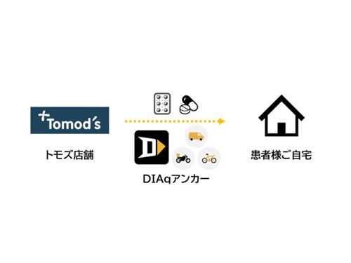 「トモズ」が2月1日から開始する、オンライン服薬指導後の処方薬配送サービスに「DIAq」の機能を組み込む。「DIAq」に登録したアンカー(配送スタッフ)が処方薬のピックアップと配送を行う。