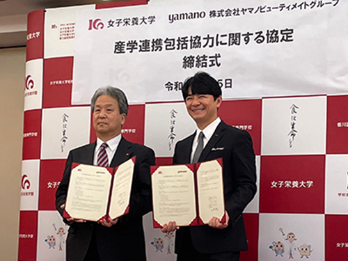 同日には、女子栄養大学駒込キャンパスで、ヤマノビューティメイトグループの山野幹夫社長と、学校法人香川栄養学園が経営する女子栄養大学の香川明夫学長が、協定締結の調印式を行った。女子栄養大学が、美容関連の企業と連携協定を結ぶのは初だという。