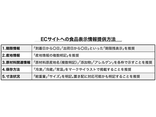 消費者庁は6月、ECサイトへの食品情報掲載におけるガイドブックを正式に公表する。食品表示基準では、容器への食品情報掲載は義務化されているが、ECサイトへの掲載は求められていない。容器と同程度の情報掲載を推奨する。事業者の意識変革を目指す。