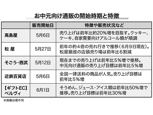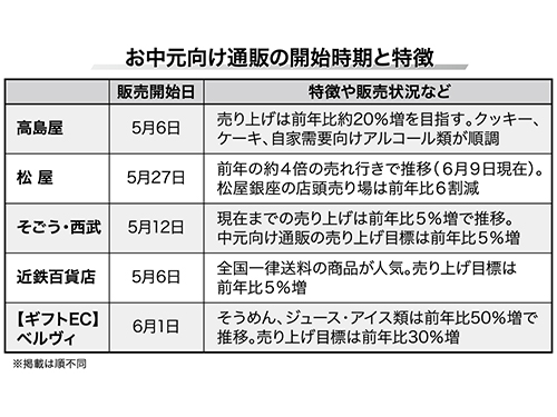 「松屋銀座」や「松屋浅草」などの松屋は5月27日から、「松屋オンラインストア」でお中元向けの通販を開始した。期間は前年より12日長い7月26日までとした。開始時期を前年より早めたこともあり、売れ行きは前年の約4倍で推移しているという(6月9日現在)。