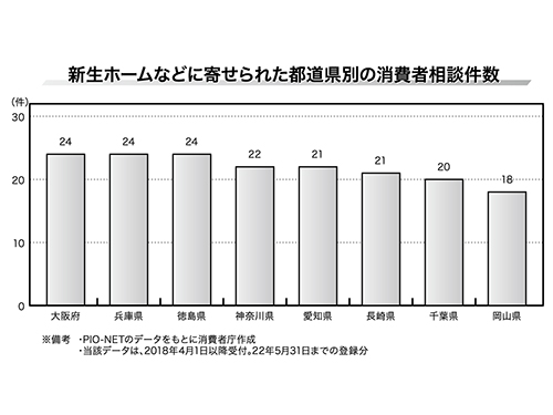 消費生活センターに寄せられた新生ホームなどの相談件数は18年度が86件、19年が138件、20年が123件、21年が29件、今年は5月末までの集計で5件だった。20年から21年にかけて、相談件数が減少したことについて、消費者庁は「営業を縮小する方向に入った可能性がある」とみる。消費者庁が確認した契約金額は平均で162万円、最高は約521万円だった。新生ホームの21年3月期の売上高は約127億円。