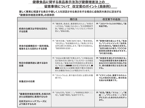 改定案では、「健康食品が有する健康保持増進効果等では解消に至らない疾病症状のような身体の組織機能等に係る不安や悩みなどの問題事項を例示して表示することは、一般消費者が表示全体から受ける印象によって、健康食品を摂取するだけで当該身体の組織機能等に係る問題が解消されるものと誤認するおそれがあり、虚偽誇大表示等に当たるおそれがある」としている。