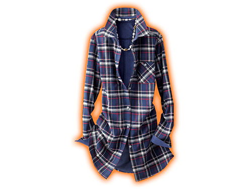 ベルーナの商品で立ち上がり好調なのが「あったか裏フリース柄ロングシャツ」と「シャツ腰巻風スカート付レギンス」。