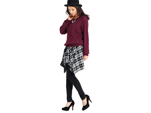 「スカート付レギンス」は、1枚で流行の腰巻コーディネートが行えるというもの。ヒップを隠せるので体型をカバーすることもできる。シャツ風スカートと一体化しており、ずれたり落ちたりすることがないという。