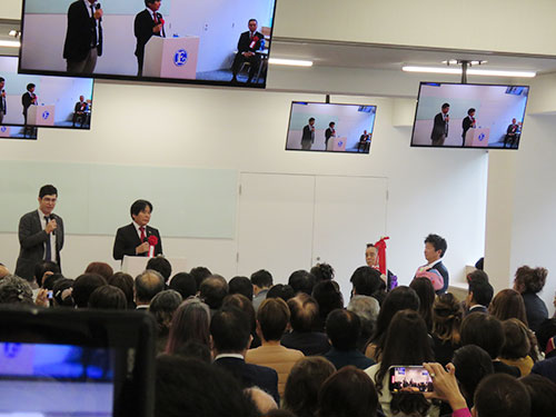 エナジックジャパンの松本弘智社長もあいさつし「エナジックの売り上げの95%は海外だが、エナジックは日本発の企業。このプラザは皆さんのためのもの。多くの人を助けてもらいたい」と話した。「日本から世界に羽ばたくエナジックに協力していただけますか」と呼びかけると、満場の拍手が起こった。