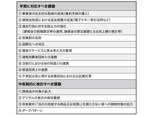 報告書では、「早期に対応すべき事項(以下早期対応事項)」として10項目、「中長期的な検討課題(以下中長期課題)」として4項目、計14項目が整理された=別表。「早期対応事項」として挙げられた項目については、今春の通常国会での法改正に盛り込まれる可能性が高いと考えられる。