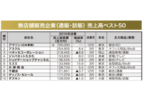 本紙はこのほど、無店舗販売企業の売上高(14年10月―15年9月期の間に迎えた決算期が対象)を調査し、上位50社をランキングにした。