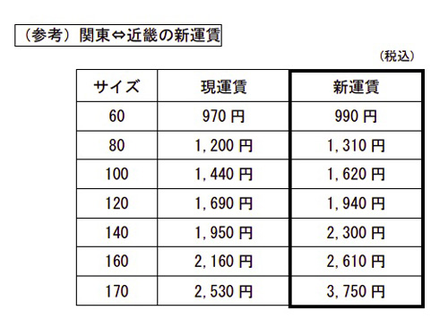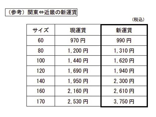 ゆうパックの基本運賃は、平均で約10%の値上げとなる。関東から近畿までの運賃は、60サイズが税込970円から990円になる。大きいサイズほど上がり幅が大きくなっている。