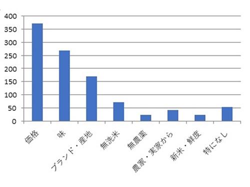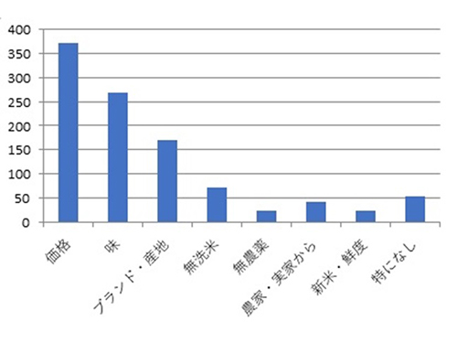 また、「コメを選ぶ際に重要視している点とその理由は何ですか?」という問いに対して、「価格」と回答した件数は370件だった。ナビットでは、1000人にアンケートを取っているため、4割弱が、安く購入できることを重要視していることが分かった。