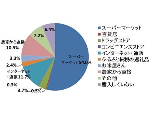 調査代行事業のナビット(本社東京都、福井泰代代表)が22年9月に発表したレポートでも、コメの購入場所として、「スーパーマーケット」と回答した人は、54.0%。「インターネット・通販」と回答した人は、11.7%だった。