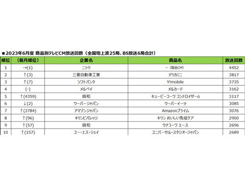 SMNグループのゼータ・ブリッジ(本社東京都、千輝仁代表)は7月24日、23年6月度のテレビCMの放送回数ランキングを発表した。1位は3カ月間連続でニトリの商品CMだった。2位が三菱自動車工業「デリカミニ」、3位がソフトバンク「Y!mobile(ワイモバイル)」だった。