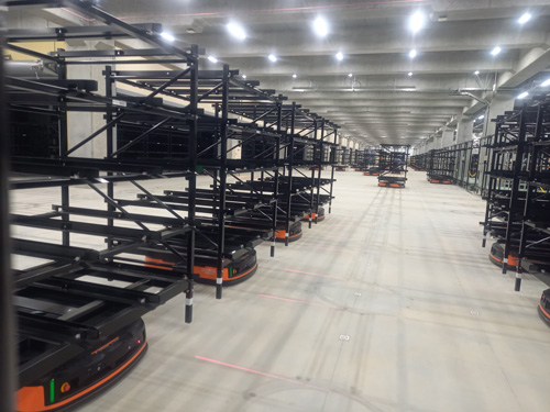 増築棟では、チラシやテレビCMなどで取り上げた重点商品を扱う。重点商品は出荷全体の約25%を占める。システムと連携した133台のAGVを活用し、ピッキングの作業負担を約20%削減する。AGVは適切な棚をスタッフの作業場所まで自動で動かし、歩行距離を大幅に減らす。