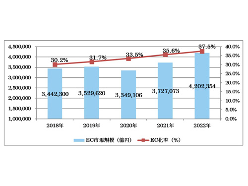 経済産業省は8月31日、22年のEC市場規模調査の結果を発表した。BtoB―EC(企業間電子商取引)市場規模は前年比12・8%増の420兆2354億円になった。CtoC―EC(個人間電子商取引)市場や日本から米中への越境EC市場も成長している。(関連記事を1面に掲載)