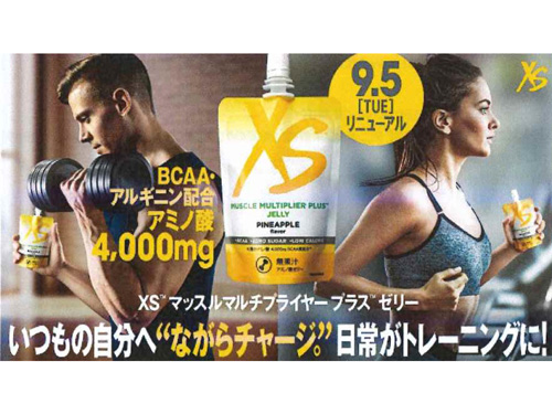 「XSマッスルマルチプライヤープラス ゼリー」は、パウダーからゼリーに形状を変更した。BCAA・アルギニンをはじめ、10種のアミノ酸を従来品の3600mミリグラムから4000ミリグラムに増量した。アルギニンも1・6倍に増量し配合。運動による引き締まったカラダづくりとリカバリーをサポートするパウチタイプのゼリーだ。