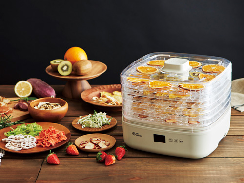 従来の「ドライフードメーカー」について、ユーザーからの意見を取り入れ、トレーの枠と網を分離できる形状に変更し、本体上面に油受けトレーと温度調節機能などを追加した。これにより、高さのあるドライフラワーや、魚の干物などを作れるようになり、使い方を広げた。レシピブックも付属していて、初心者の人にも使いやすく、さまざまな食品の乾燥に挑戦できるようにしたという。