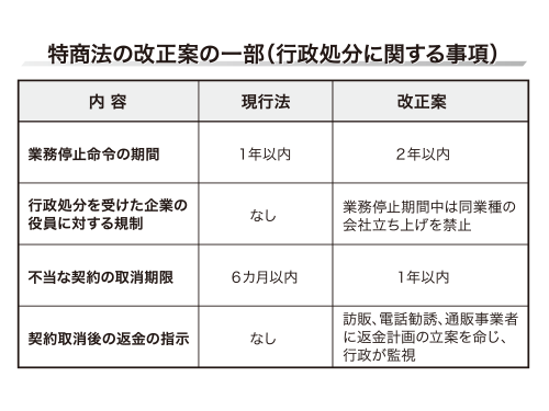 特定商取引法(特商法)の改正案の一部が明らかになった。業務停止命令の最長期間を現行法の1年から2年に引き上げるほか、訪販や電話勧誘などで虚偽説明などを行った場合、契約を取り消した上で事業者に顧客への返金を指示する規定を設ける方針だ。行政処分を受けた企業の役員が別法人を立ち上げることを一定期間禁止する規定も盛り込む。政府は改正案を今国会に提出し、年内の成立を目指す。