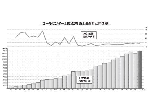 日本流通産業新聞社は10月、電話応対業務を受託するコールセンター企業の売上高を集計した「第30回コールセンター売上高調査(22年度)」をまとめた。ランキングに掲載した35社の合計売上高は1兆2808億6200万円となった。前年実績と比較可能な24社から算出した実質伸び率は4.2%増だった。市場としても成長は続いているが、コロナ禍と比べると成長は緩やかになっている。