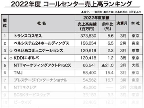 3位にはりらいあコミュニケーションズ、4位にはKDDIエボルバがランクインした。この2社は今年9月、経営統合し、アルティウスリンクを設立した。これにより、同社の事業規模は売上高は2400億円、取引先は1300社以上、従業員は約5万8000人、拠点数は約100拠点となった(トップインタビューを2面に掲載)。