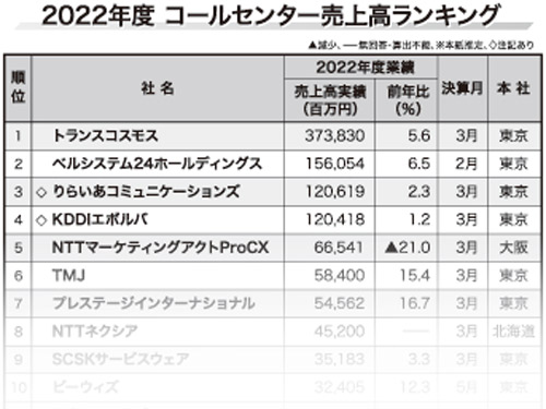 【コールセンター売上高調査】 伸び率は4.2%増/35社の合計売上高は1兆2808億円(2023年10月26日号)
