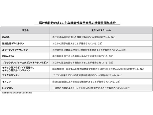 消費者庁では、機能性表示食品の関与成分として届け出件数が多いものを「参考例」として提示している=別表参照。