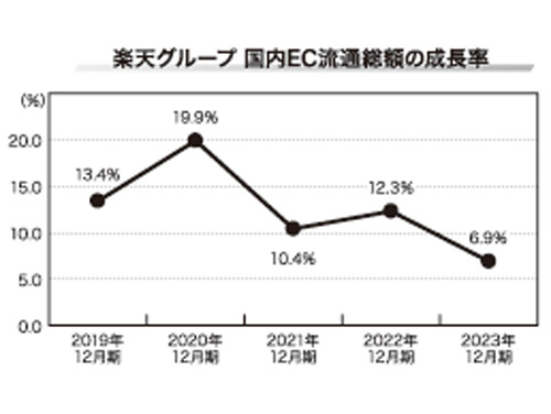 楽天グループ(楽天)が2月14日に発表した23年12月期における国内EC流通総額は、前期比6.9%増の6兆487億円だった。コロナ特需の反動もあるが、国内EC流通総額の増加率は直近5期の決算を見ると、20年12月期の19.9%増をピークに段階的に下がり、今回は1桁台に突入した。外的要因やモバイル投資の余波などの影響で、今後も成長は一時的に鈍化する見通しだ。日本を代表するECモール「楽天市場」はこのまま沈んでしまうのか、それとも逆転のシナリオはあるのか。モバイルの契約拡大と、売り場の進化、店舗の結束が、「楽天市場」の今後の成長を左右しそうだ。(関連記事を3面に掲載)
