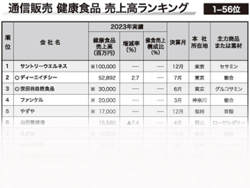 健康食品通販最大手のサントリーウエルネス(本社東京都)は、今回も不動の1位の座をキープした。サントリーウエルネスの23年12月期の売上高は、