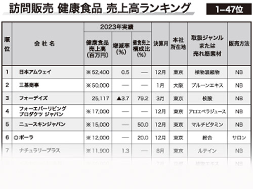 【2024年版 訪販健康食品売上高ランキング】 〈成長率は横ばい〉合計売上高3428億円超/好不調の明暗分かれる(2024年3月28日号)