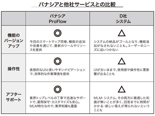 ネットワークビジネス(NB)企業へのシステム支援やコンサルティングサービスを提供するパナシア(本社大阪府、柴山正支社長)はこのほど、パソコン上で組織図全体をスムーズに見渡すことができる「スマートマップ」の提供を開始した。新規NB企業は、NB基幹システム「ProFlow(プロフロー)」の導入に合わせて、オプションで提供する。既存クライアントには、切り替えの提案を進める。