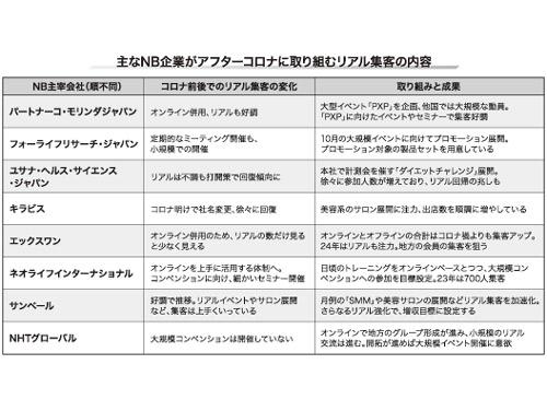 コロナ禍で対面での活動が制限されてきたNB業界は現在、活動の場をリアルに戻す動きが本格化している。コロナ以前の集客まで回復させた企業がある一方、中堅NBでは集客が落ち込んだまま苦戦している企業もあるようだ。